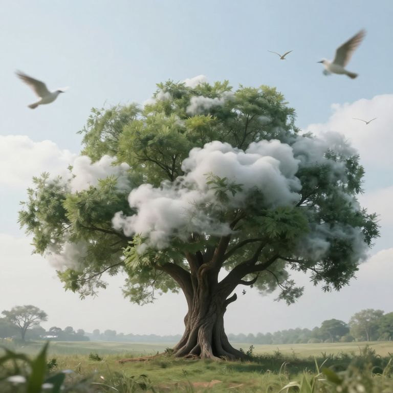 Photograph of a large, lush green tree with dense foliage, standing alone in a grassy field under a clear blue sky. White, fluffy clouds are partially enveloped in the tree's leaves, creating a surreal effect. Two birds are in mid-flight, one on the left and one on the right, adding movement to the serene scene. The tree's thick, dark brown trunk is robust and textured. In the background, a distant treeline and a slightly hazy horizon are visible, enhancing the sense of depth. The overall composition blends natural elements with a whimsical touch.