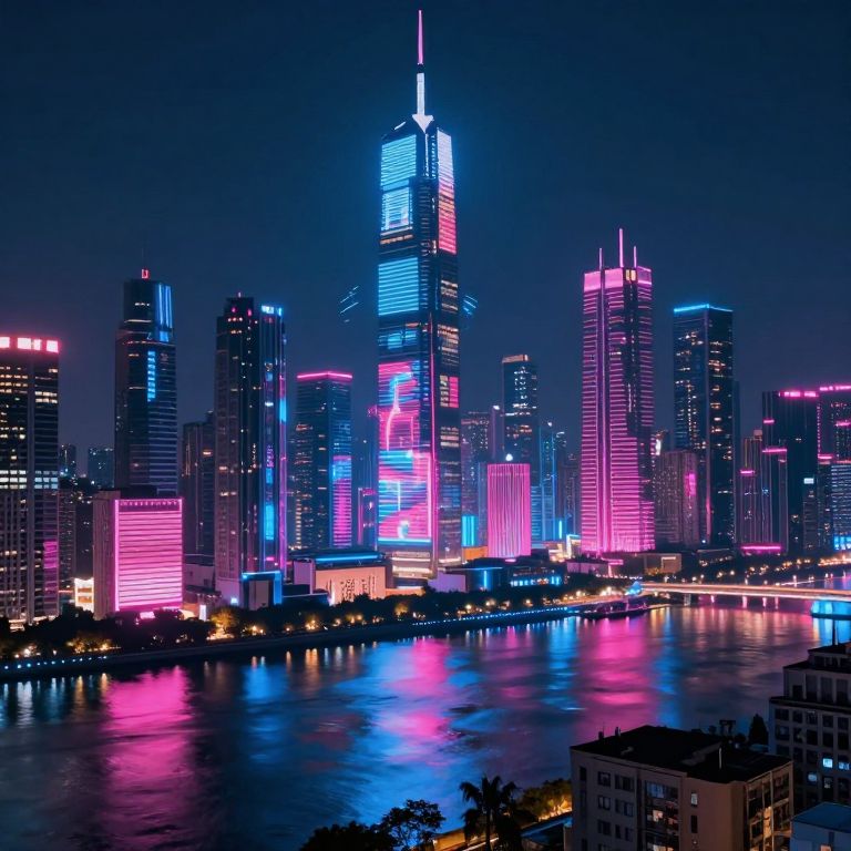 Wallpaper:wbrsym49cze= futuristic cityscape at night with neon lights and holographic displays, sleek skyscrapers reflecting in a river, deep blues and bright pinks dominate the scene, high detail digital painting style, immersive and dynamic atmosphere, perfect for sci-fi enthusiasts