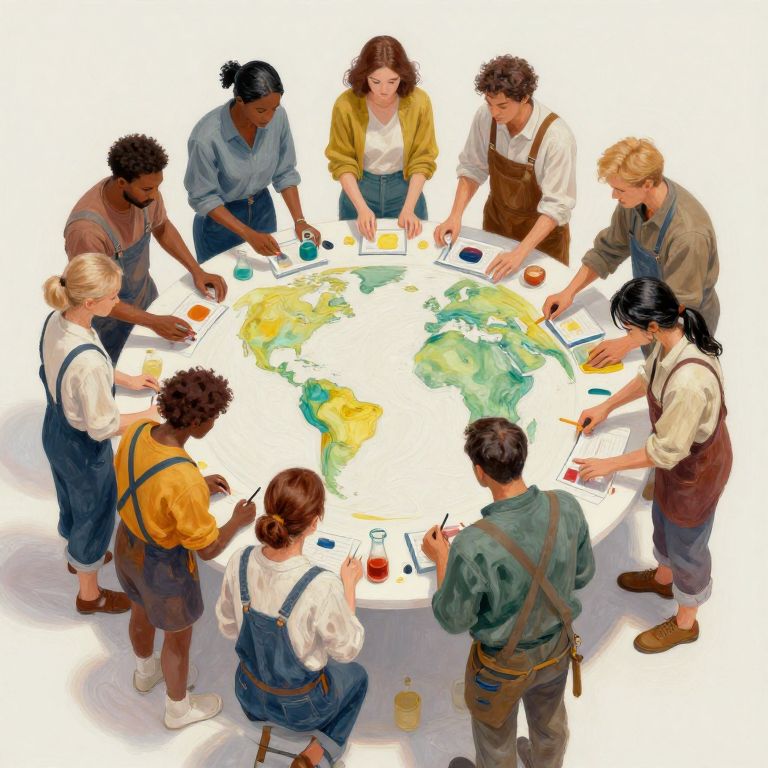 Illustration of diverse group of seven people, wearing casual, rustic clothing, gathered around a table with Earth map, writing notes.
