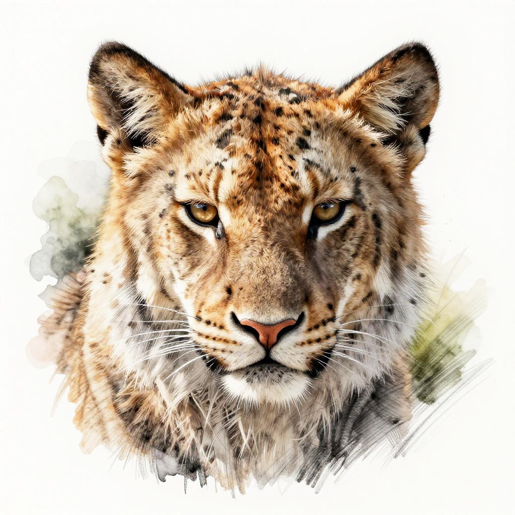 Photo to illustration AI transforming a close-up wildlife photo into a detailed digital sketch, combining intricate pencil textures and watercolor splashes to highlight fur textures and natural light effects