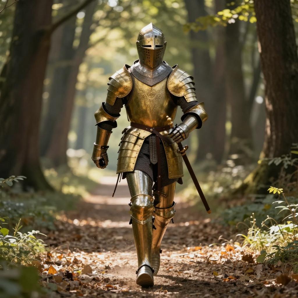 A medieval knight dressed in full golden armor running through a sunlit forest path. The armor is detailed with intricate engravings and the scene is illuminated by sunlight filtering through tall trees in the background, creating a dramatic and dynamic atmosphere.
