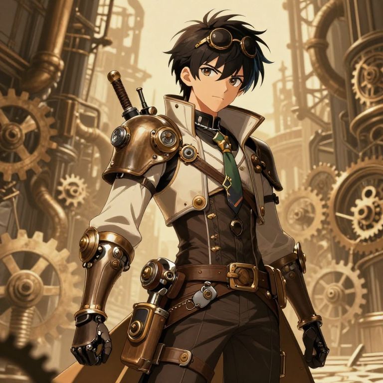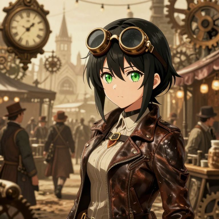 Anime girl black hair green eyes with an adventurous look, wearing steampunk goggles and leather jacket, standing in a Victorian marketplace with clocks and gears, warm sepia tones, bustling crowd, slightly rugged textures, dynamic composition