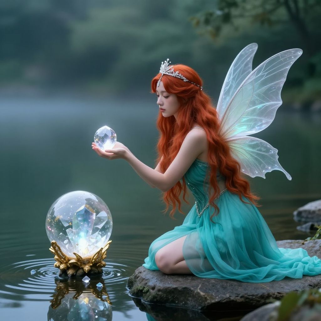 A serene red-haired fairy with delicate translucent wings and a silver tiara kneeling on a rock by a tranquil lake. She is wearing a flowing teal dress and holding a large, glowing crystal in her hand. Nearby, a larger crystal orb adorned with gold details hovers above the water surrounded by small floating gems. The misty forest background adds to the magical atmosphere.