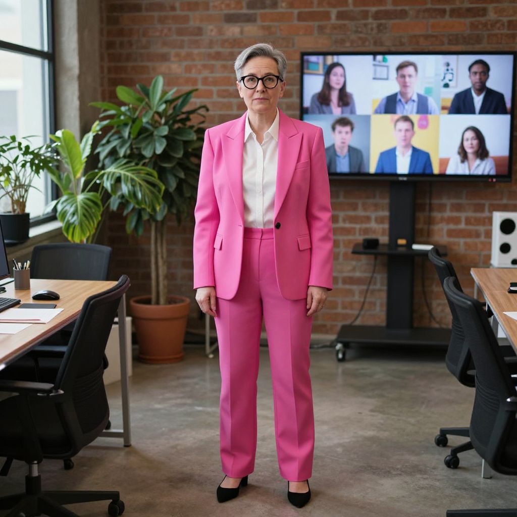 An office worker in their 40s with a kind face, gray hair neatly trimmed, and glasses wearing a bold pink trouser suit as a costume during a quirky office party in a modern loft space with exposed brick walls, plants, and a large screen showing funny clips, the suit slightly humorous and out of place yet eye-catching, creating a lighthearted, real-life moment.