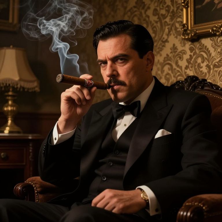 Photograph of a suave, dark-haired man in a black tuxedo, smoking a cigar, with blue smoke curling upward, in a