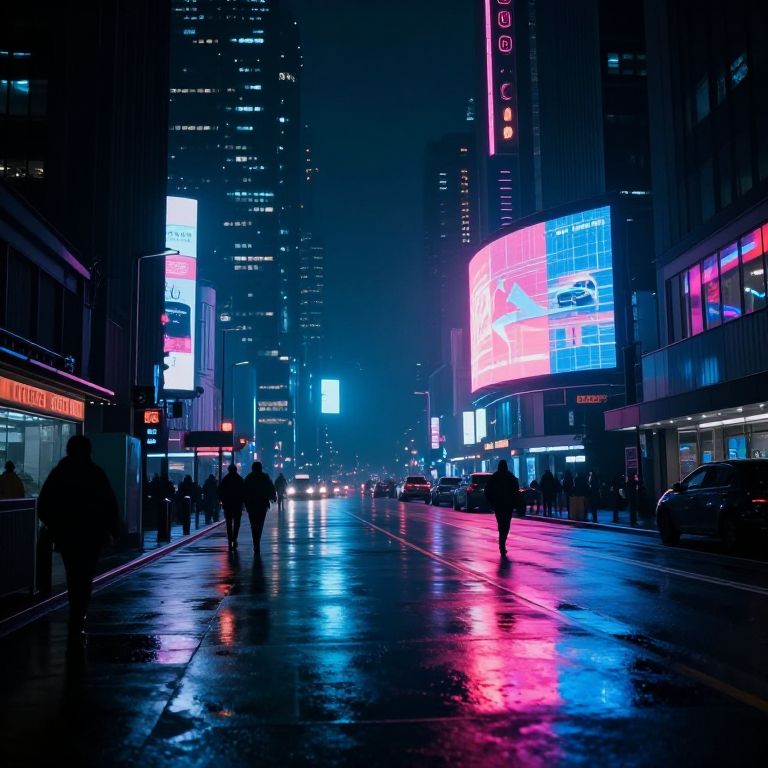 Goiteens exploring a futuristic city at dusk, neon lights reflecting on wet streets, dynamic crowd in cyberpunk attire, vibrant digital billboards, atmospheric fog blending with glowing colors, cinematic wide angle, high detail realism.