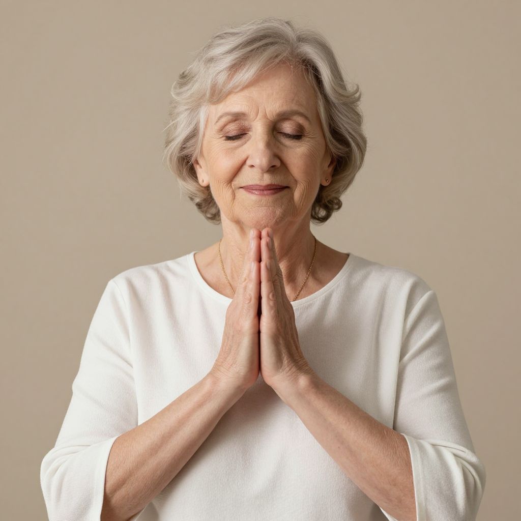 In a serene embrace of self and spirit, a senior woman stands with hands pressed in namaste, her gentle smile radiating a warmth that transcends time, symbolizing the enduring connection between inner peace and the eternal flow of life.