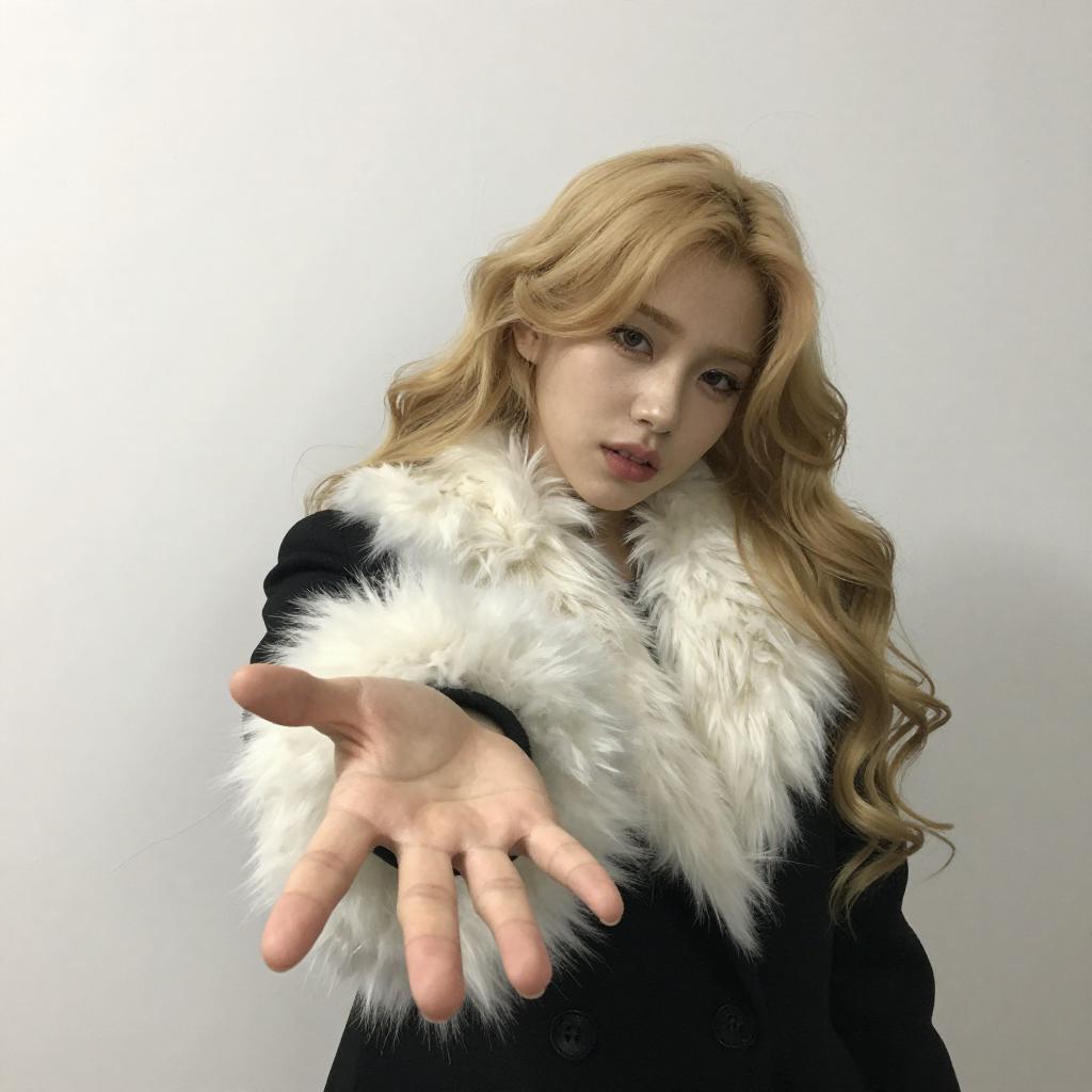 Photograph of a young woman with long, wavy blonde hair, wearing a black coat with a white fur collar. She is reaching forward with her right hand, slightly tilting her head and looking directly at the camera. The background is a plain, white wall with subtle cracks. Her expression is neutral, and the lighting is bright, creating a high contrast with her dark coat.