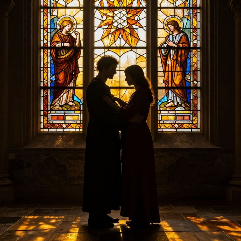 Photograph of a silhouetted couple standing in front of a vibrant stained glass window in a church. The couple, dressed in long robes, face each other with hands gently touching. The stained glass features colorful, symmetrical religious figures with halos, set against a backdrop of geometric patterns. Sunlight filters through the glass, casting warm, golden hues on the floor and the couple's figures. The background is dark, highlighting the bright, intricate details of the stained glass. The overall mood is intimate and sacred.