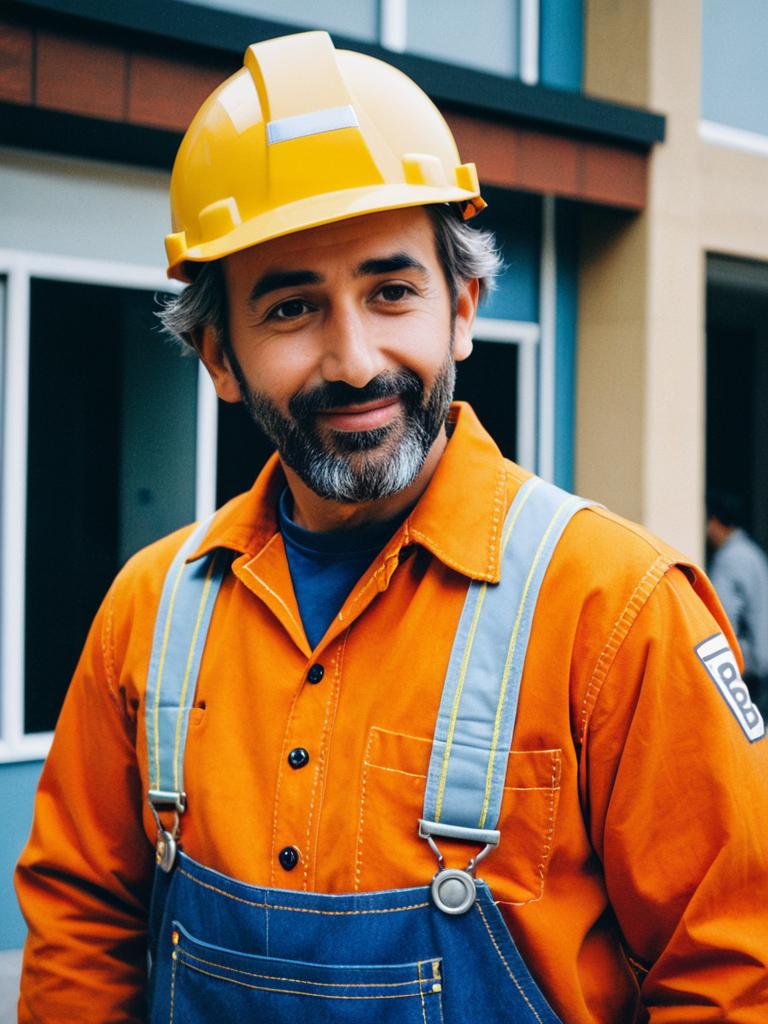 Man in Bob the Builder Costume, cinematic realism, playful editorial cosplay portrait
