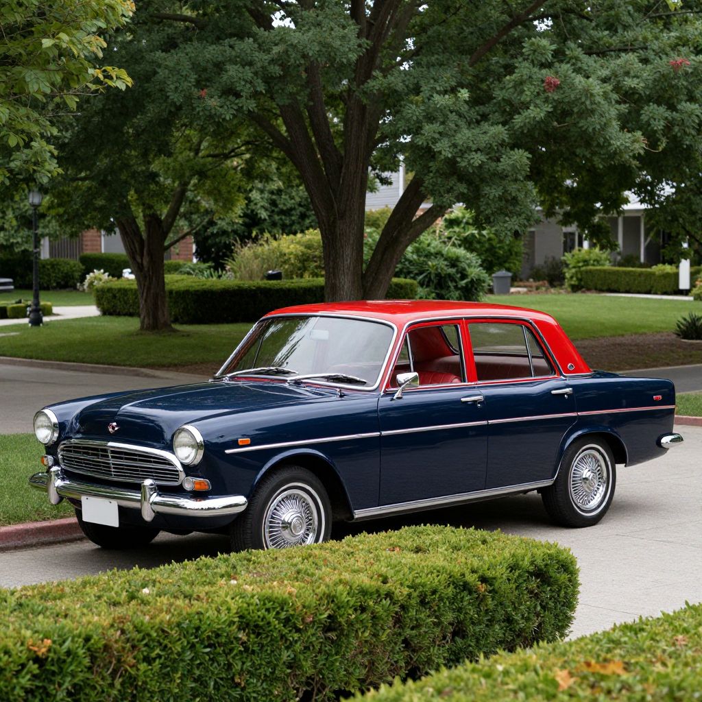 Classic navy-blue sedan with vibrant red accents and polished chrome details is parked gracefully in front of neatly trimmed green hedges, showcasing its timeless elegance against a backdrop of lush trees and a serene suburban setting.