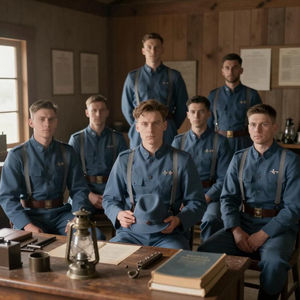 Photograph of three soldiers in a green-walled barracks room. One soldier in brown uniform stands, holding a small object, looking to the left. Another soldier in gray uniform lounges on a top bunk, looking forward. Third soldier lies on the floor, head resting on a bag, looking up. Circular window in background. Oxygen tanks on floor. Top bunk has metal frame. Bright lighting.