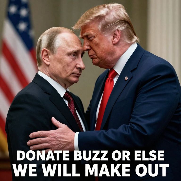 Incredibly accurate photo-realistic photo of Vladimir Putin and Donald Trump in a tender embrace typical of a romance novel cover, Fancy text along the bottom of the image reads'; \"DONATE BUZZ OR ELSE WE WILL MAKE OUT\