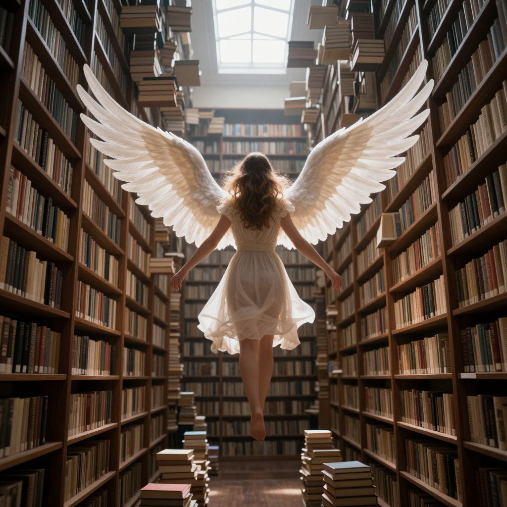 Ethereal wings spread wide, a woman gracefully soars through an endless library aisle, surrounded by cascading books and soft light filtering through high windows, as she embraces the boundless realm of knowledge and imagination.