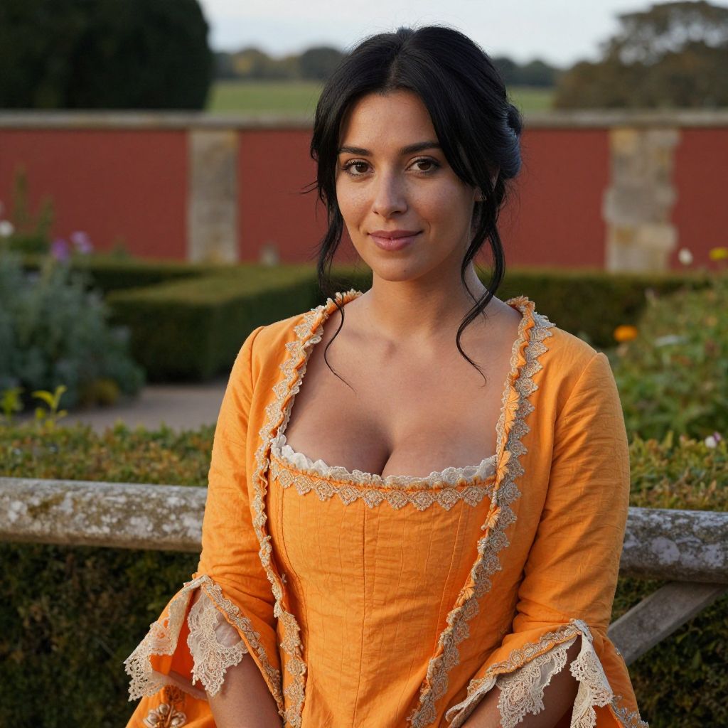 A naturalistic photography scene of a woman with a smooth complexion, high cheekbones, and straight black hair styled in a bun, dressed in a vibrant orange Bridgerton costume with ornate lace trim and delicate sleeves, seated on a garden bench in a British countryside estate during golden hour, with a blurred backdrop of manicured hedges and a red stone wall.. The woman has big breasts and cute face