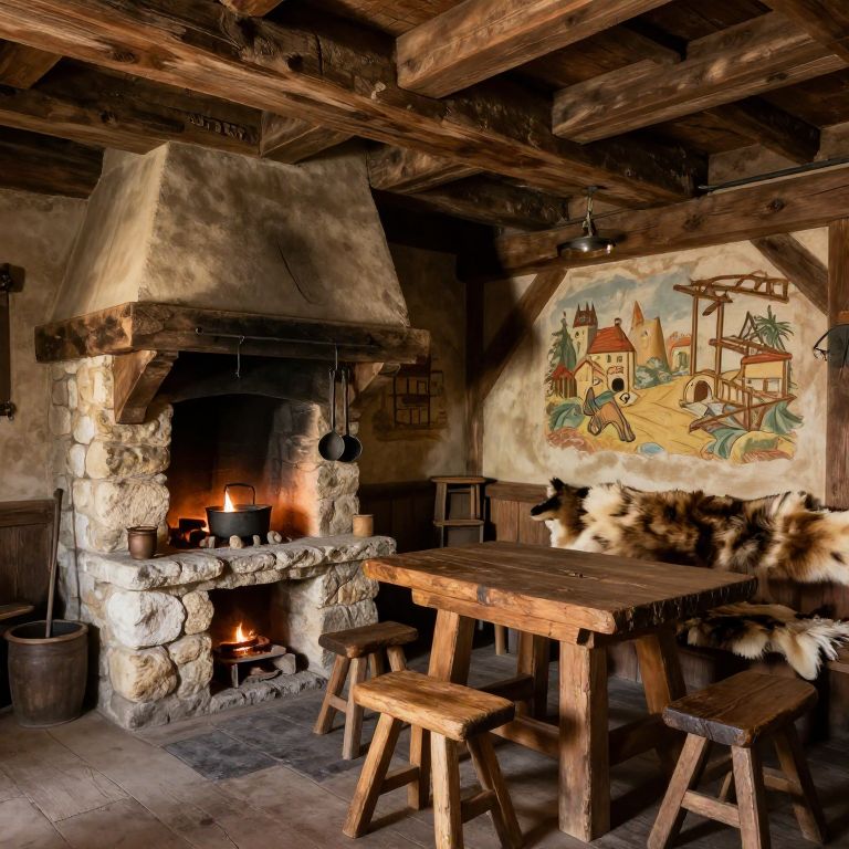 Detailed medieval cabin interior showing timber frame construction, a stone hearth with cooking utensils hanging nearby, wooden stools and a rough-hewn table, animal pelts on the bench, faded wall murals depicting village scenes, gentle firelight illuminating the cozy space.