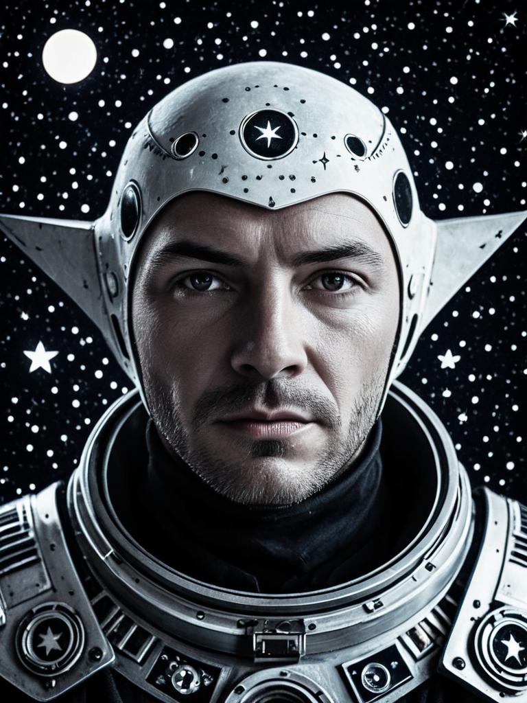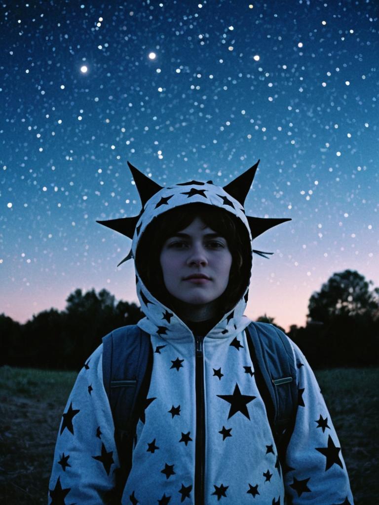 Person in Stars and Moons Costume, outdoor portrait at twilight