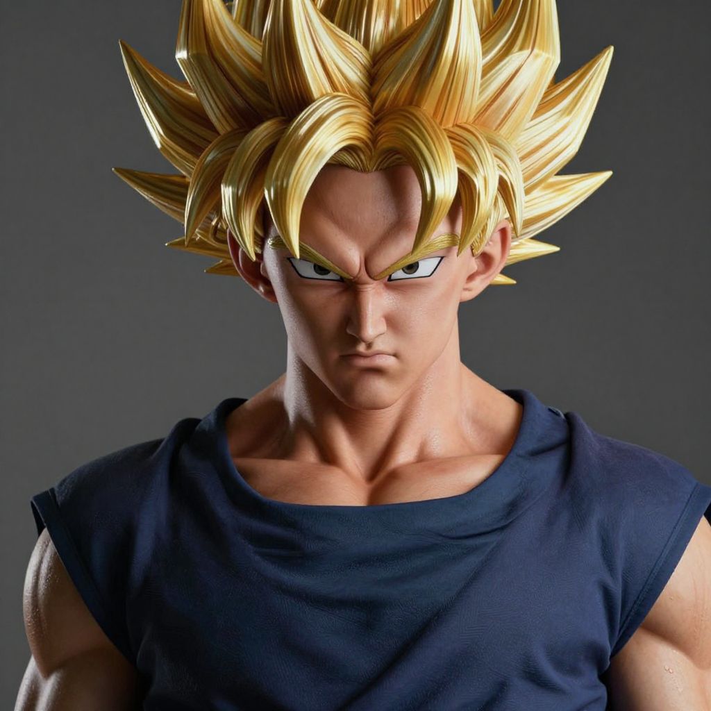 Photorealistic digital artwork of Son Goku from Dragon Ball, showcasing his iconic golden spiky hair and intense expression. He has a muscular build with defined shoulders and arms, wearing a simple black sleeveless shirt. His skin is fair, and his eyes are sharp and focused. The background is a solid, dark gray, highlighting Goku's vibrant hair and determined gaze. The lighting accentuates his muscular definition and adds depth to his features. The overall style is hyper-realistic, capturing the character's classic anime appearance with meticulous attention to detail.
