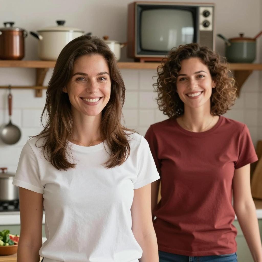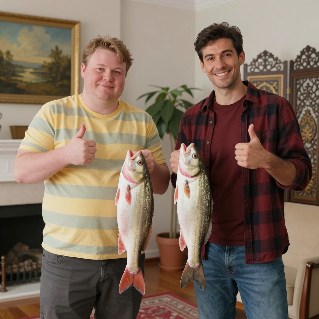 Two men standing in a room, holding fish. Man on left, overweight, short brown hair, yellow-green striped shirt, pink fish. Man on right, lean, short dark hair, red shirt, plaid shirt, white fish. Both thumbs up. Background: painting, white fireplace, red rug, green plant, ornate screen.