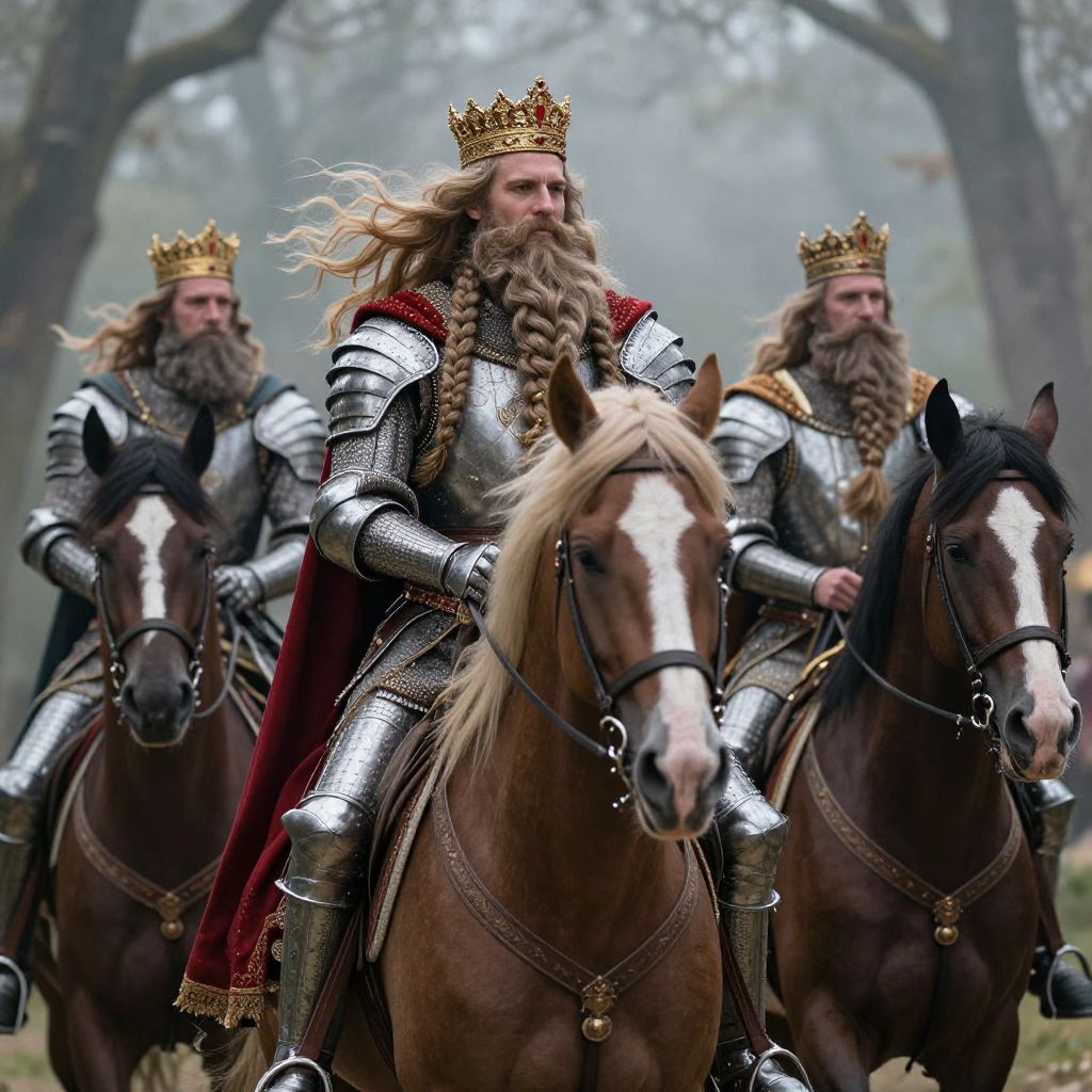 Photograph of a muscular, shirtless man with long blonde hair, a full beard, golden crown, and black cape, standing confidently.