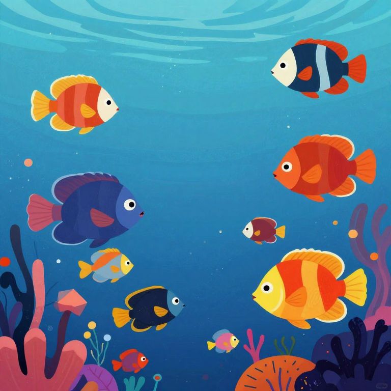 Craft an image in a whimsical style reminiscent of Mary Blair's imaginative works, showcasing a surreal underwater scene from a unique worm's-eye perspective. The image features vibrant colors of exotic fish and sea creatures contrasted against abstract geometric shapes that seem to float and dance with the water currents, creating a captivating composition that embodies both wonder and mystery of the deep blue sea. This enchanting visual narrative evokes feelings of joy, curiosity, and exploration through its imaginative use of color and form, inviting viewers into an otherworldly aquatic realm filled with vibrant life and mesmerizing movement.