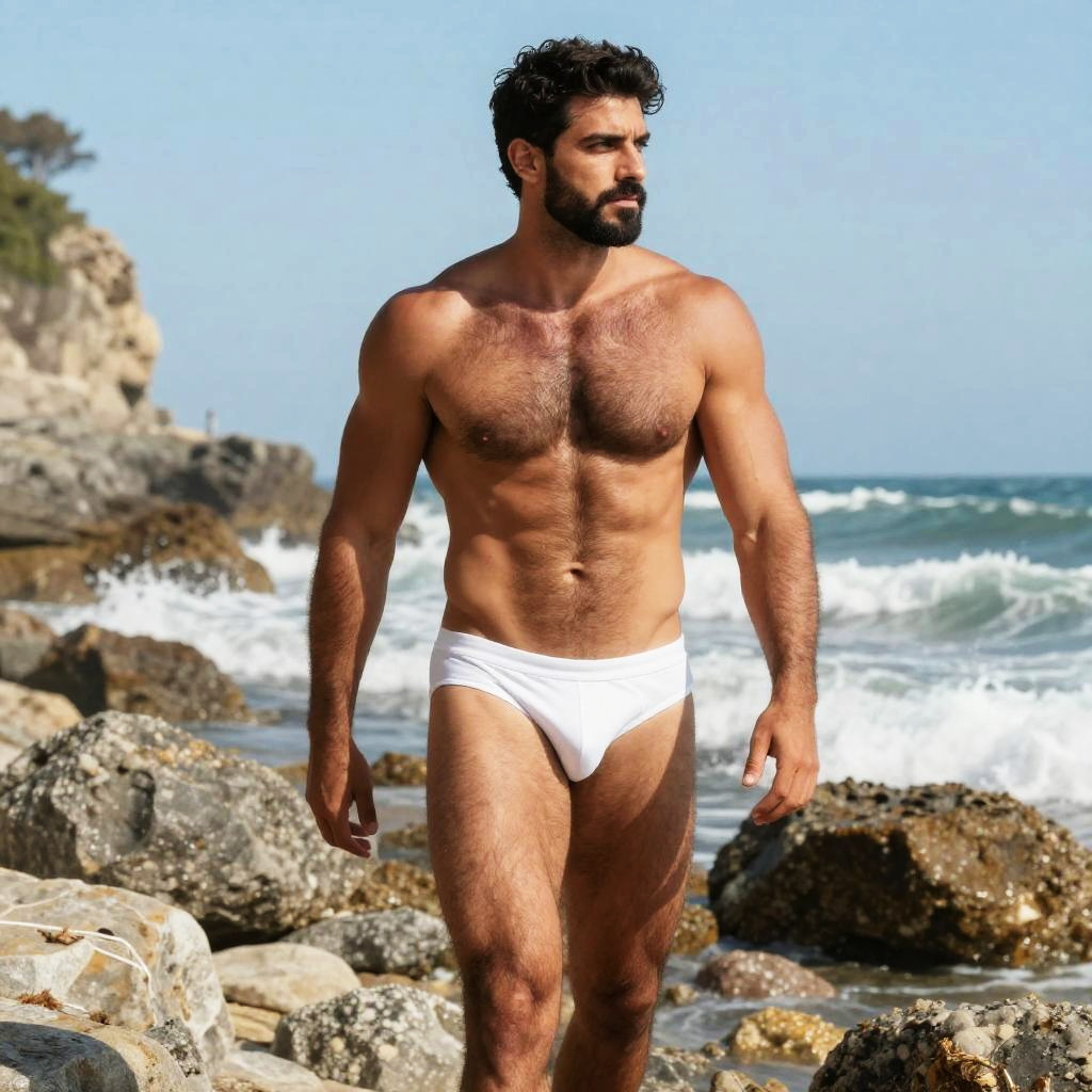 Photograph of a muscular, bearded man with dark hair standing on a sunny beach. He's wearing tight white swim trunks, highlighting his defined abs and chest. His tan skin glistens with water droplets. He's wearing a black wristwatch on his left wrist. The background shows clear blue ocean waves and rocky cliffs under a bright blue sky. The man looks directly at the camera with a confident expression.