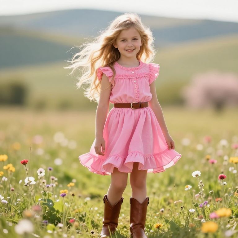 A young girl with soft, curly brown hair and bright, curious eyes stands in a sunny meadow, wearing a vibrant pink dress with delicate ruffles and a matching pink headband. A small pink flower is gently tucked into her hair, adding a touch of charm. She is also wearing a pair of stylish brown boots adorned with soft pink ruffles, giving her a playful and whimsical look. The scene is warm and colorful, with daisies and wildflowers surrounding her, bathed in golden sunlight, creating a joyful and enchanting atmosphere.