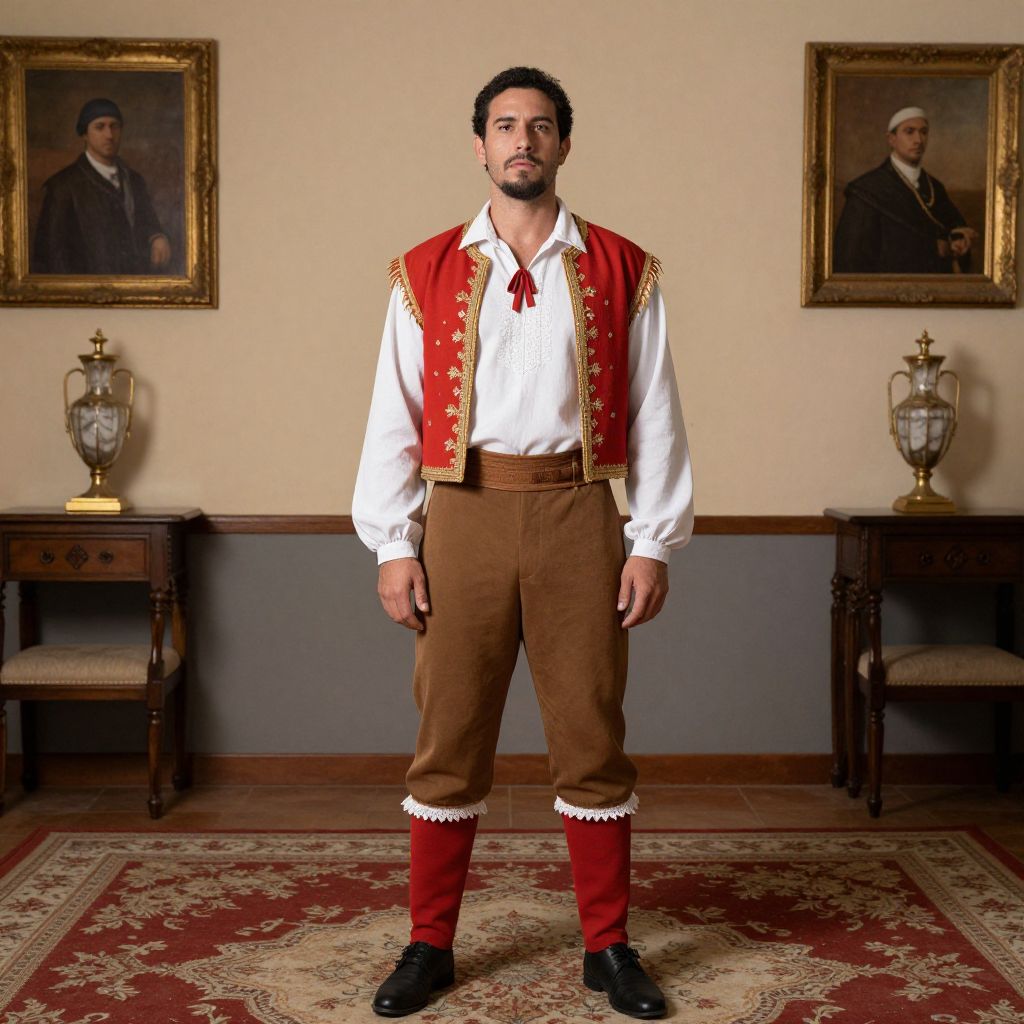 Photograph of a bearded man in traditional Spanish attire, white shirt, red vest, brown pants, red socks, black shoes, standing in a