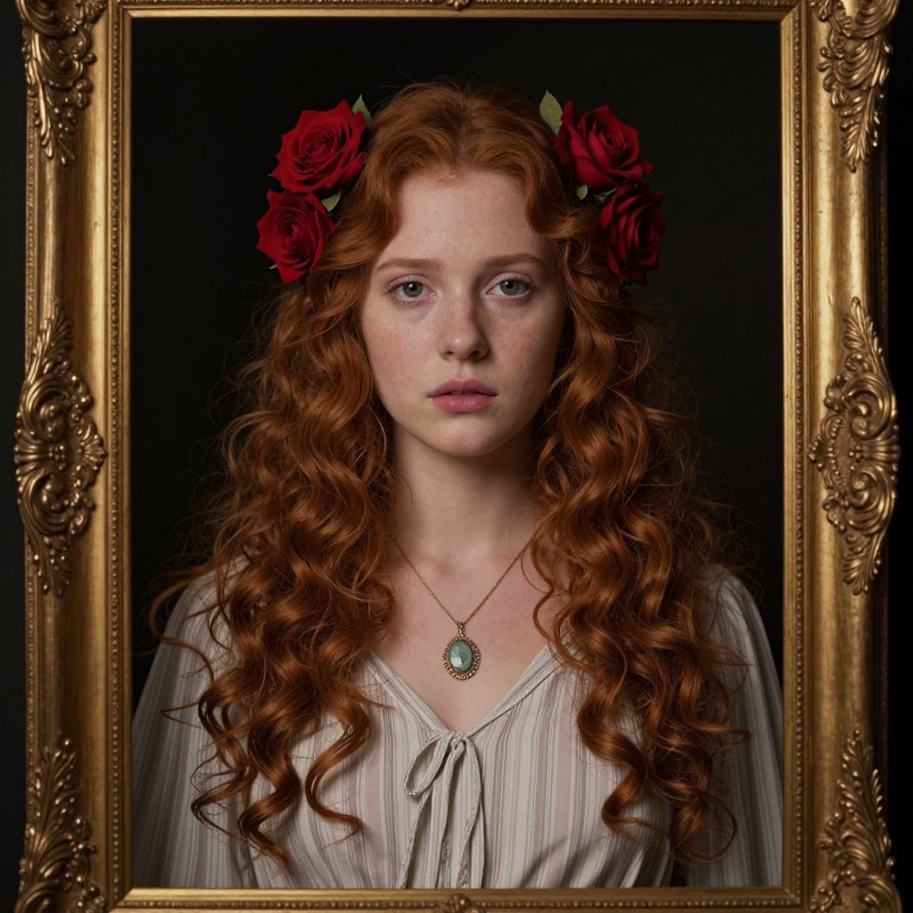 The image depicts a highly detailed and realistic portrait of a young woman, reminiscent of the Lovers Tarot card. She has long, curly auburn hair adorned with red roses, adding a touch of elegance and romance. Her expression is serene and contemplative, with a slight hint of melancholy. She is wearing a light-colored, striped blouse with a delicate necklace and a pendant, which complements her attire. The background is dark, creating a stark contrast that highlights the subject's features and the intricate details of her clothing and accessories. The overall composition is balanced, with the woman centrally positioned, and the ornate, gold-colored frame surrounding her, enhancing the sense of depth and grandeur. The interplay of light and shadow adds a three-dimensional quality to the image, making the textures and colors of her hair, skin, and clothing appear vivid and lifelike.