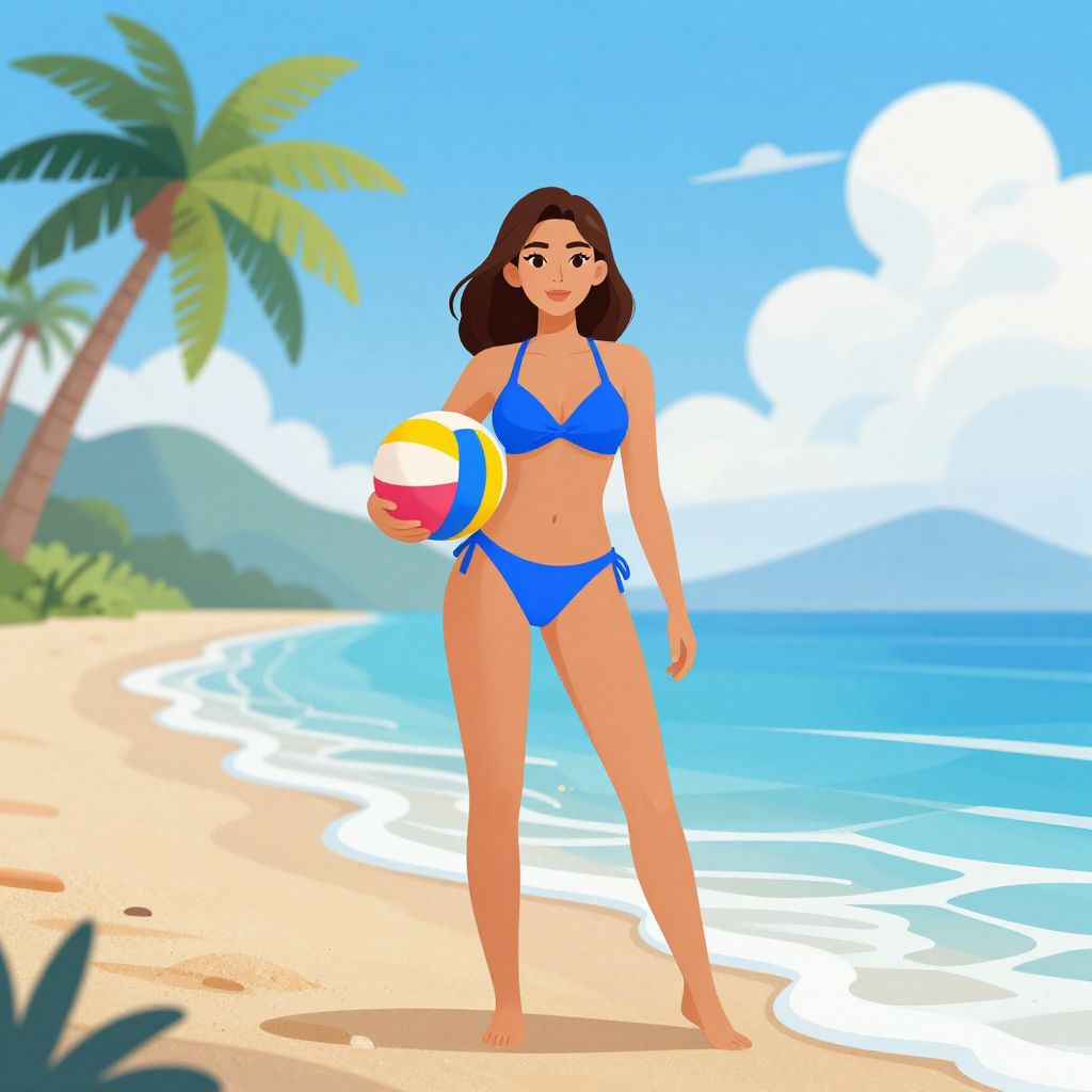 Digital illustration of a tan-skinned woman with brown hair in a blue bikini, holding a beach ball, standing on a sunny beach with palm trees and