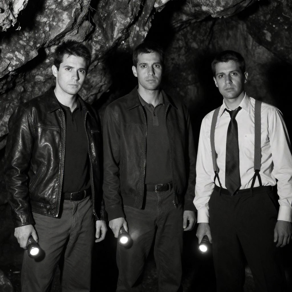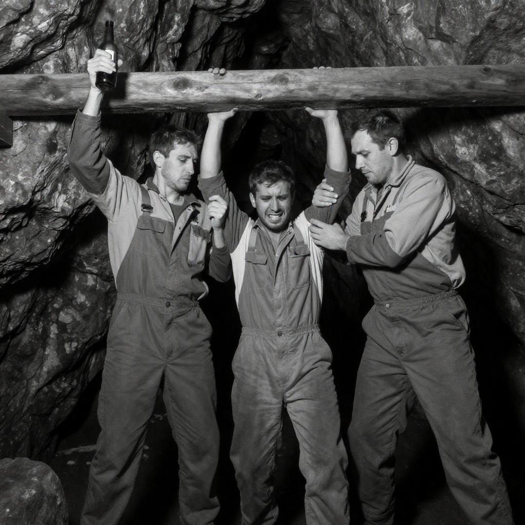 Black-and-white photograph of three men in a dark, rocky cave. Two men pull a third man by the arms through a wooden beam. The man being pulled has a distressed expression. All men wear heavy work clothes. The cave has rough stone walls. The man on the left holds a bottle in his raised right hand. The man on the right reaches forward with his left hand.