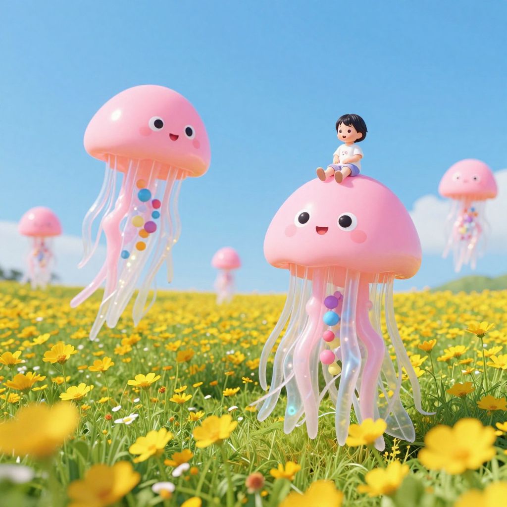 In a whimsical digital art rendering, children perch atop a vibrant pink jellyfish as it glides through a surreal cityscape, where modern buildings twist and warp like taffy, mirroring the fantastical and dreamlike atmosphere of the scene.
