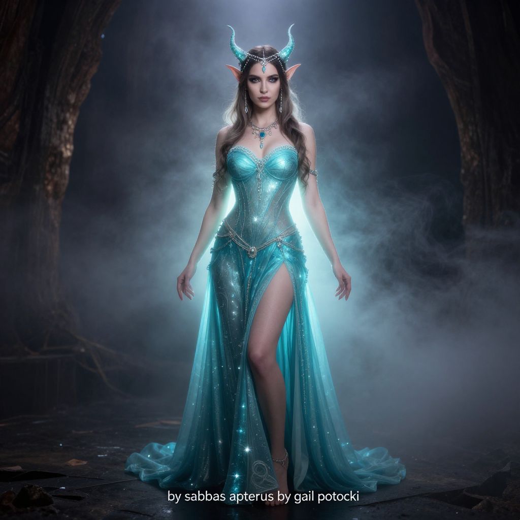 Photograph of a fantastical elf woman with glowing blue horns, wearing a shimmering blue, form-fitting gown with a high slit, standing in
