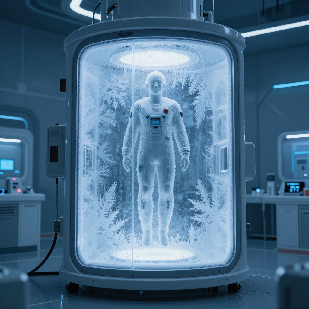 Cryostasis chamber glowing softly in an icy blue laboratory, futuristic technology with frosty condensation on transparent surfaces, a suspended human figure inside, surrounded by delicate frost patterns and high-tech machinery, hyper-realistic sci-fi atmosphere.