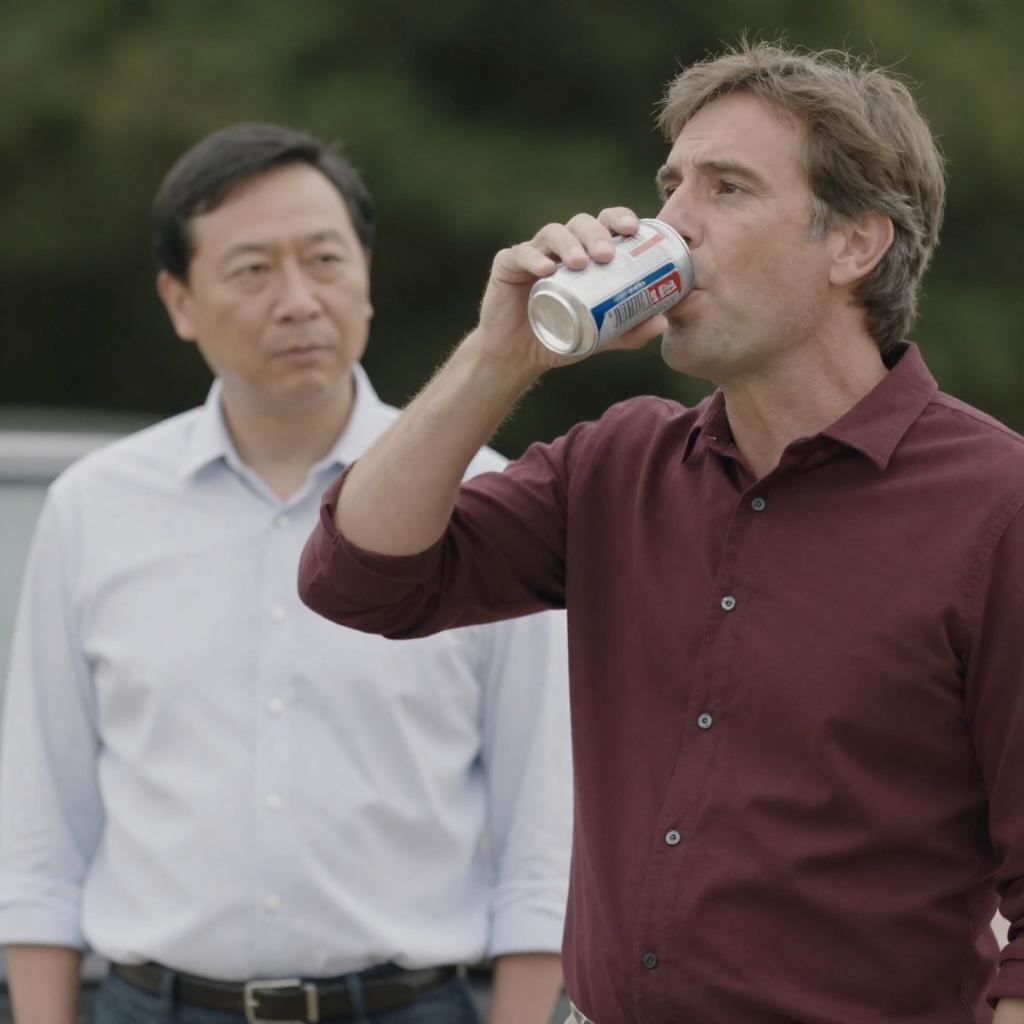 Photograph of two middle-aged men outdoors. The man on the right, with light brown hair, wears a maroon shirt and drinks from a can, while the man on the left, with dark hair, wears a white shirt and looks on. A car and trees are in the background.