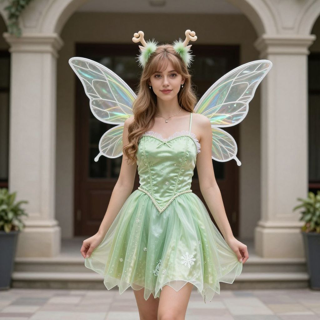 Photograph of a young woman in a pastel green fairy costume with translucent wings, antler headband, and long brown hair, standing in front
