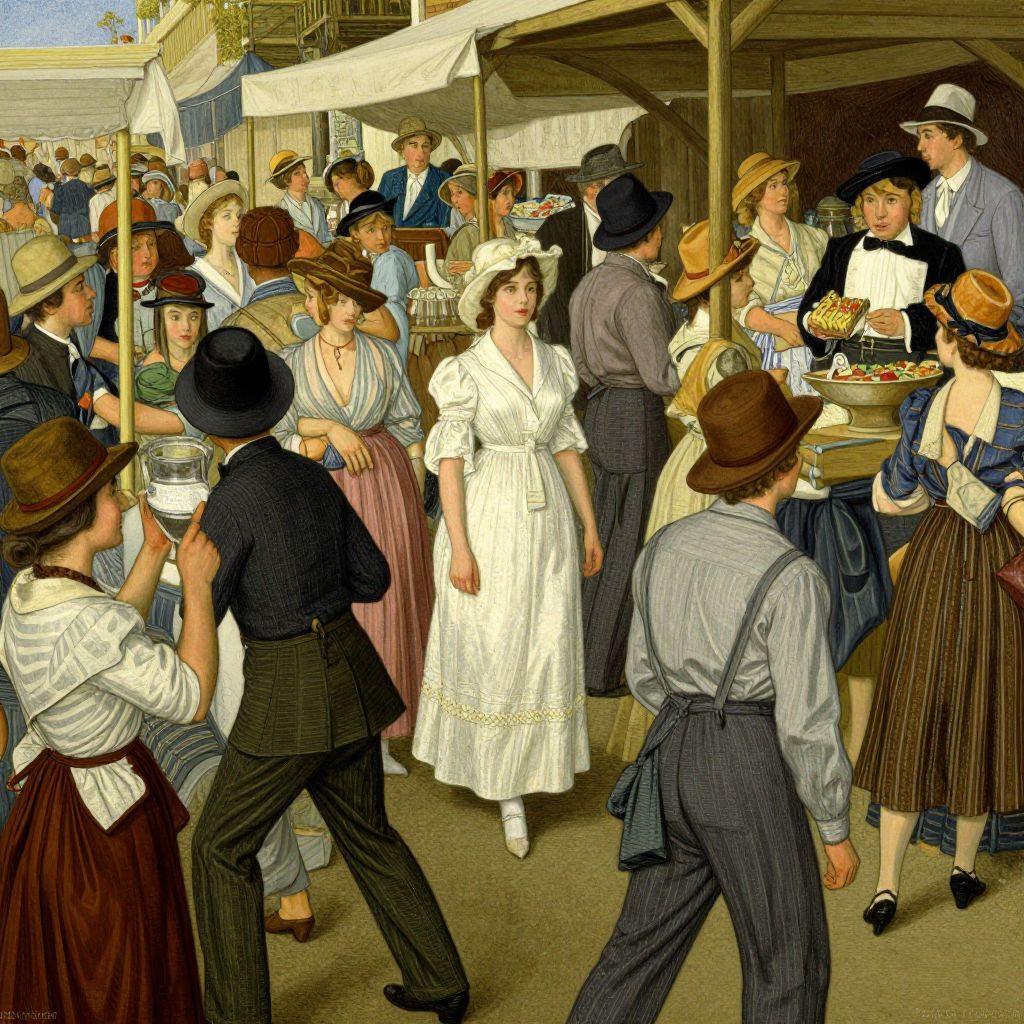 This vibrant, digitally enhanced photograph depicts a bustling 19th-century fair with a diverse crowd. Men and women, dressed in period attire, including bowler hats, striped trousers, and dresses with puffed sleeves, mingle and converse. A woman in a white, lace-trimmed dress stands out in the center, while others wear darker, more muted colors. The background shows wooden stalls with white canopies and people enjoying food and drinks. The image has a rich, colorful palette and a slightly exaggerated, almost cartoonish style, emphasizing the lively atmosphere of the fair.