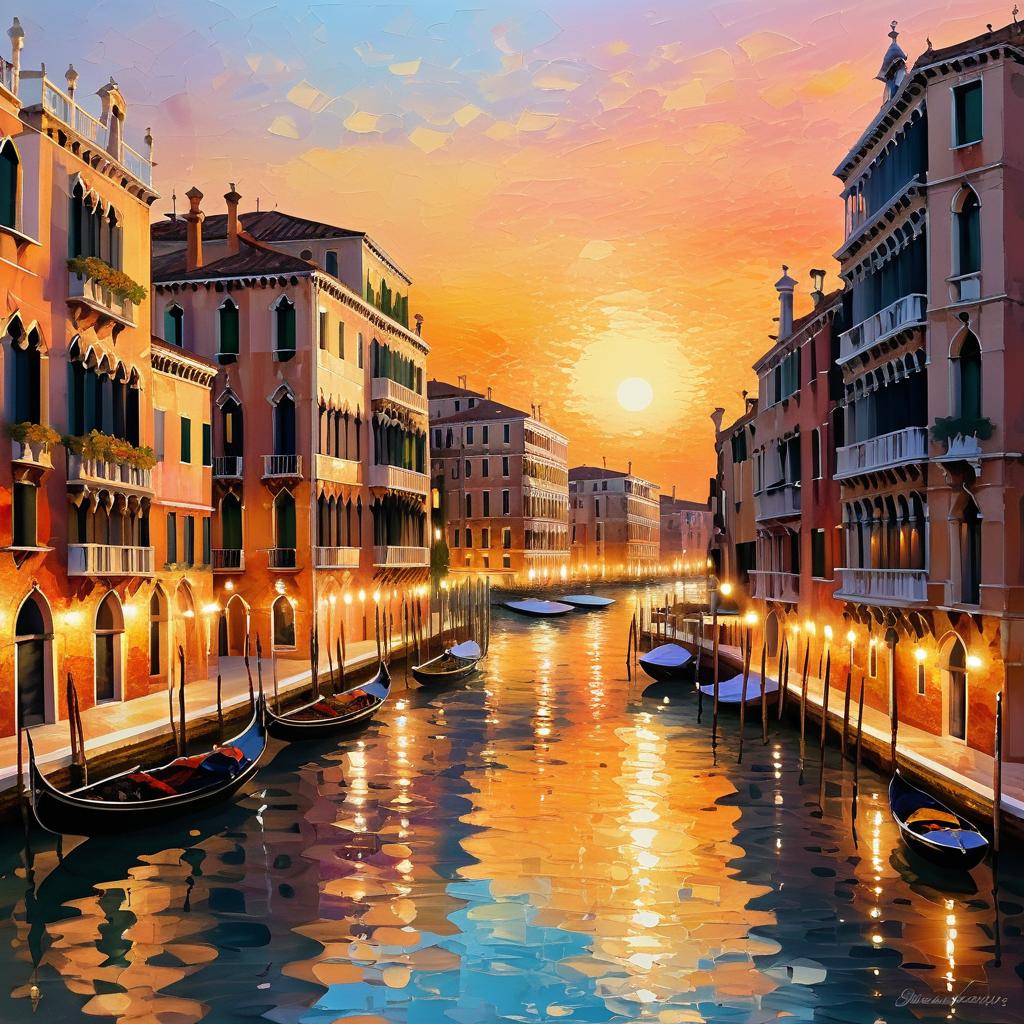 Oil painting style image of the Grand Canal in Venice, Italy at sunset. Traditional Venetian gondolas docked along the canal with historic buildings and the domed Santa Maria della Salute church glowing in warm light. The sky transitions from orange to blue with reflections shimmering on the water.