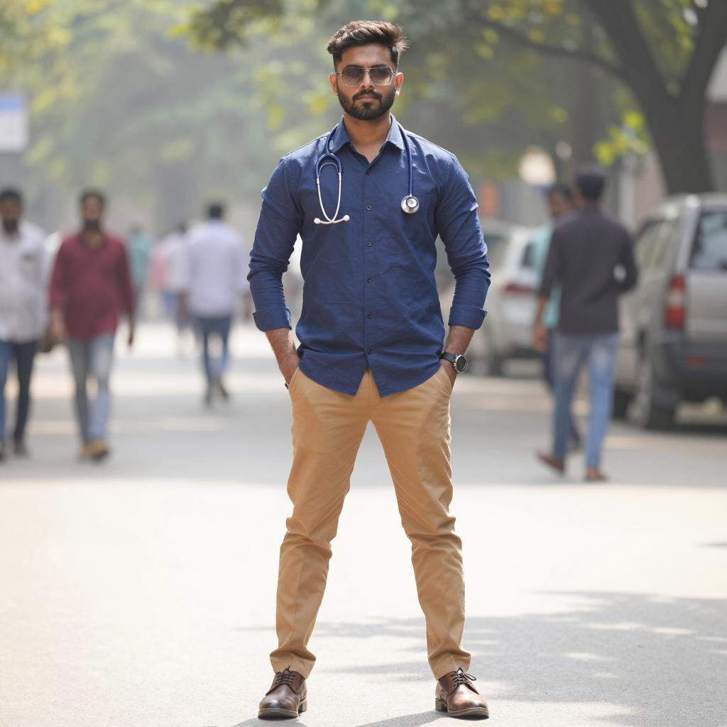 Party wear short kurta man, photorealistic portrait, attractive young man, medium skin tone, short dark hair, neatly groomed beard, wearing olive green traditional long kurta with intricate brown lace neckline, standing in a sunny courtyard, blurred background with people, archways, and plants, daytime, casual pose, confident expression, realistic lighting, digital art, high detail, standing center frame, medium shot, natural shadows, warm colors