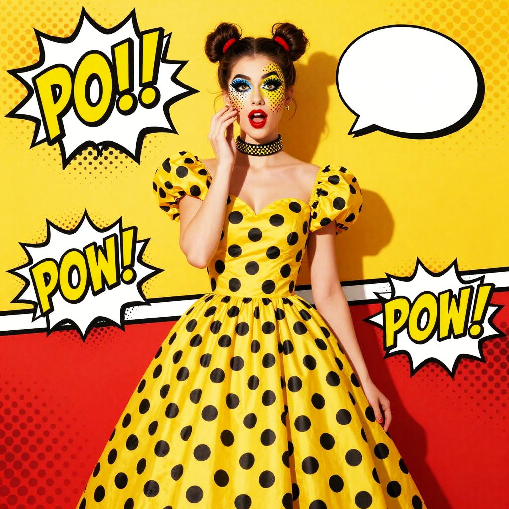 Photograph of a fair-skinned woman with dark, wavy, vintage-style hair adorned with a black and yellow polka dot headband. She wears a white, short-sleeved, polka dot blouse with black dots and a red bow tie. Her yellow, high-waisted, flared skirt is covered in blue and black polka dots with red stripes. She has striking red lipstick and blue eyeshadow. The background is a vibrant, psychedelic pattern of large and small blue, yellow, and orange circles and dots, creating a lively, retro 1960s pop art vibe. Her pose is confident, with hands gracefully holding the skirt's sides.