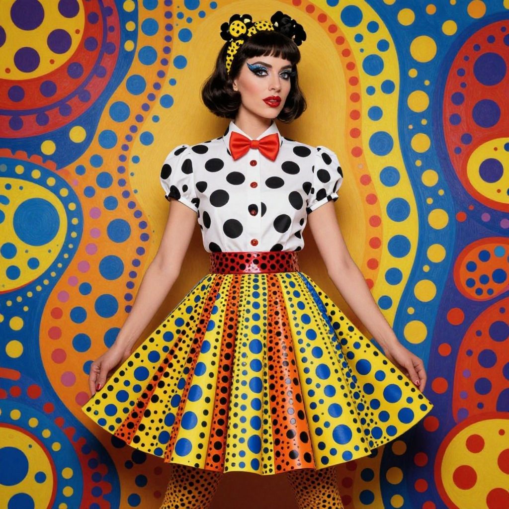 (32k resolution, masterpiece, ultra high quality, best quality, ultra high definition, perfect anatomy, incredibly detailed, raw, ultra super realistic, photorealistic, cinematic lighting, exquisitely detailed, extremely intricate, 8k uhd, high resolution), araffe woman in a short skirt and polka dot shirt, inspired by yayoi kusama, fauvism style, retro and fantasy style, retro 60 s fashion, bold and colourful, kitsch fashion, in style of pop art, inspired by kusama, vibrant and dynamic, inspired by yayou kusama, lisa frank & sho murase