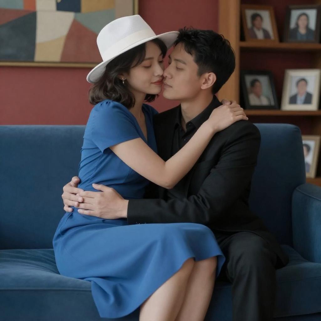 Photograph of a man and woman in an intimate embrace on a blue couch. The woman, in a blue dress and white hat, sits on the man's lap. He wears a black suit. Background features a red wall, abstract painting, and shelf with framed photos. The woman's face is slightly turned, showing a calm expression.