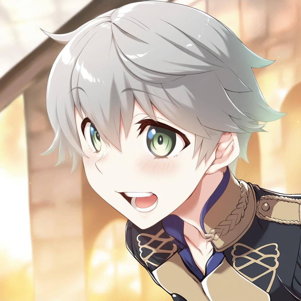 Ashe ubert, fire emblem, 1boy, green eyes, grey hair, freckles, garreg mach monastery uniform, uniform, garreg mach monastery uniform, uniform, by artist ebido, leet
