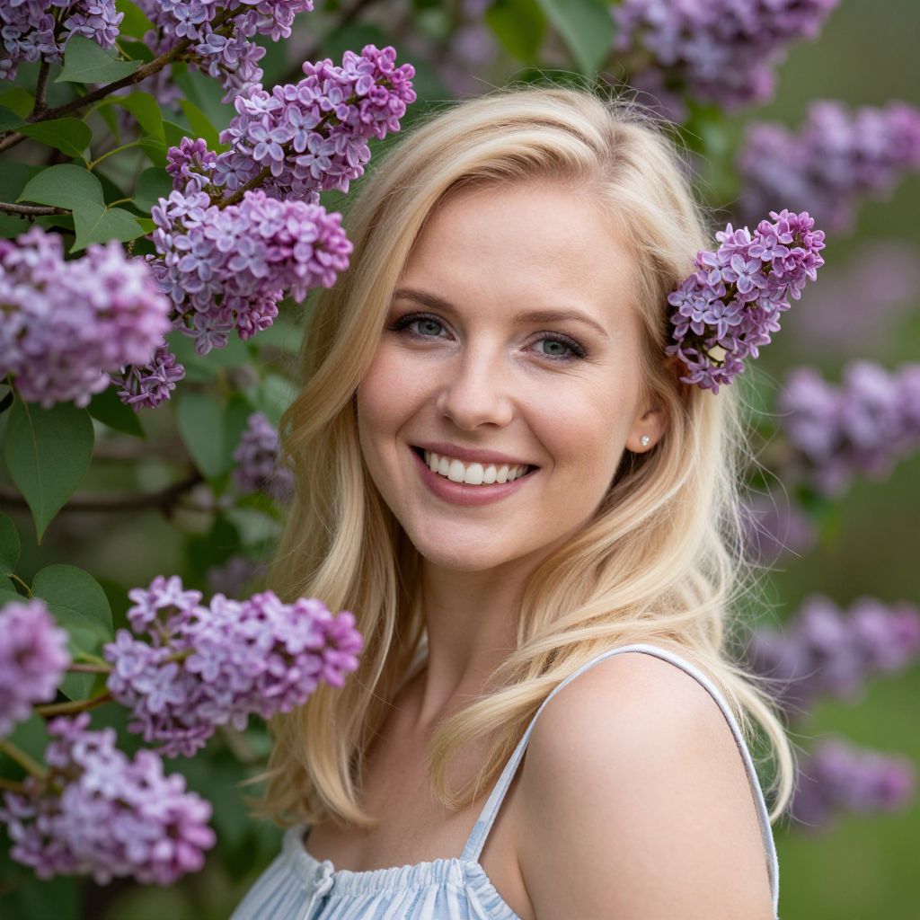 Photograph of a smiling blonde woman with fair skin and blue eyes, standing amidst vibrant purple lilac flowers. She has shoulder-length, wavy hair and is wearing a white, sleeveless top with thin straps. The background is a lush, green garden filled with more lilac blooms, creating a natural and serene setting. The image has a bright, colorful, and slightly exaggerated, almost hyper-realistic style, emphasizing the vividness of the lilacs and the woman's cheerful expression.