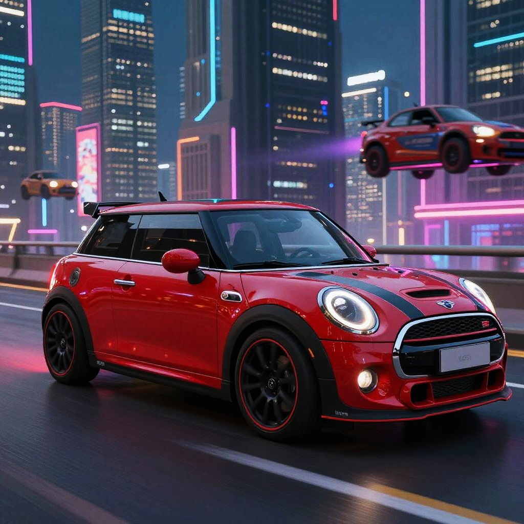Red mini cooper modified, futuristic makeover with aerodynamic enhancements, glowing underbody lights, tinted windows, sleek black rims contrasting the vibrant red, cruising through a neon-lit cyberpunk cityscape with towering skyscrapers and hovering vehicles.