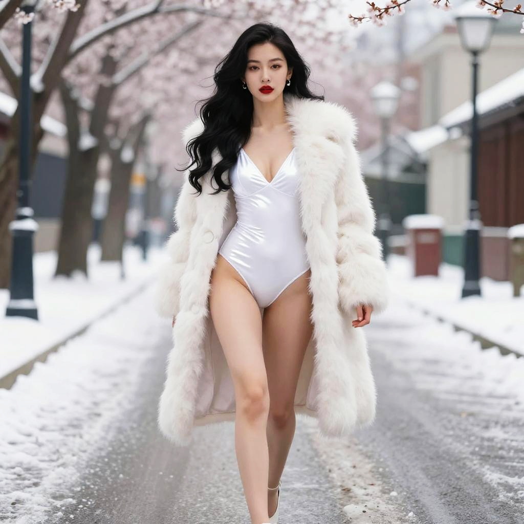 A digital art image of a stunning woman with long, wavy black hair walking down a snowy, cherry blossom-lined street. She's wearing a shiny, white, one-piece swimsuit with a deep V-neck, paired with a luxurious, white fur coat that's open. She has red lipstick, earrings, and white heels. The background shows a softly blurred street with lamp posts and buildings.