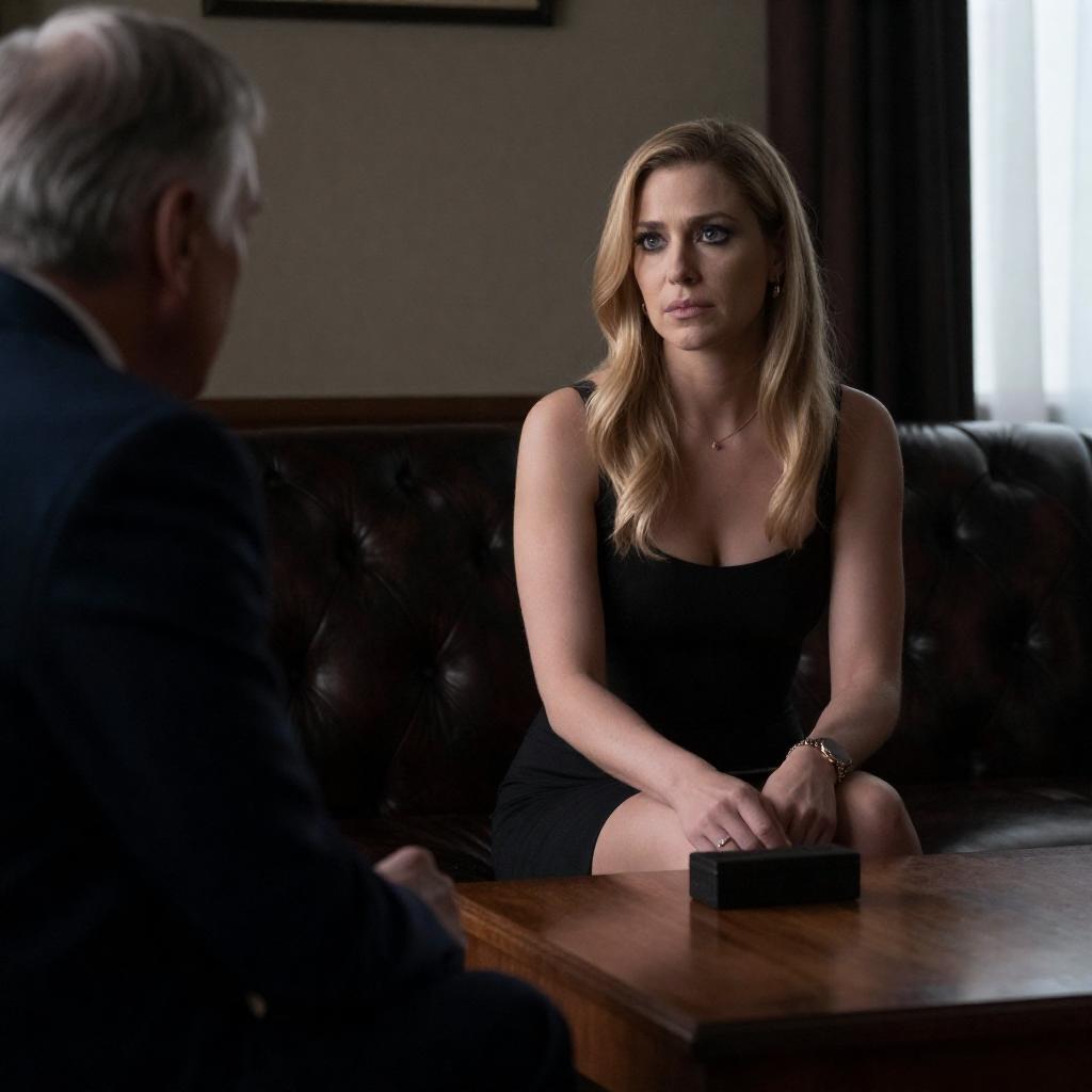 Photograph of a pregnant woman with short blonde hair, wearing a white dress and gray cardigan, leaning on a dark wooden table. A middle-aged man with short gray hair, wearing a dark coat, sits across from her, clasping his hands. They are in a dimly lit room with a white fireplace in the background.