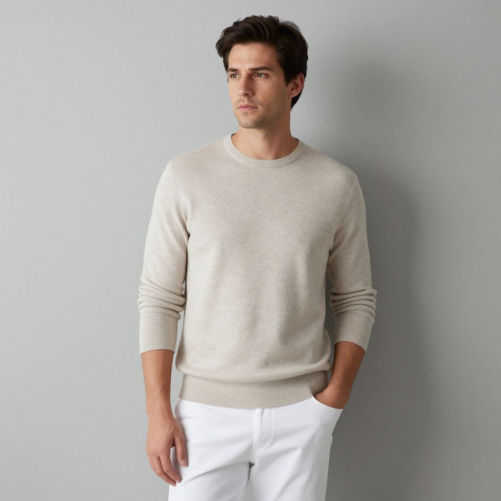 Photograph of a young man standing against a plain light gray background. He has short, dark brown hair and a light complexion. He wears a beige, long-sleeved, rib-knit sweater with the sleeves slightly rolled up and white, straight-legged pants. His right hand is in his pocket, and he gazes off to the left with a neutral expression. The lighting is even, highlighting the texture of his sweater and the smoothness of his pants. The image has a clean, minimalist style, focusing on the contrast between his outfit and the background.