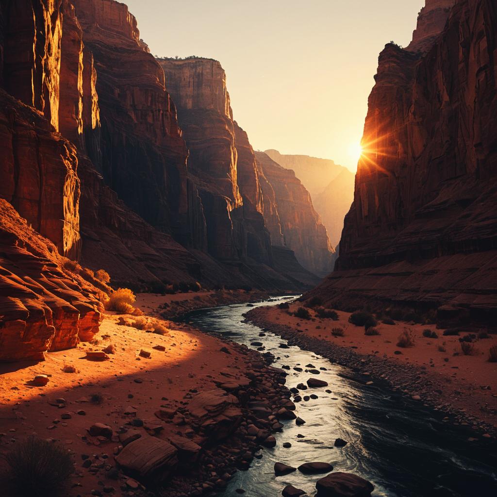 Scenic view of a canyon illuminated by golden hour lighting, showcasing fiery reds and deep oranges. A river flows gently through the canyon, reflecting the warm sunlight. The atmosphere is serene and tranquil with soft, diffused light highlighting the rugged rock formations.