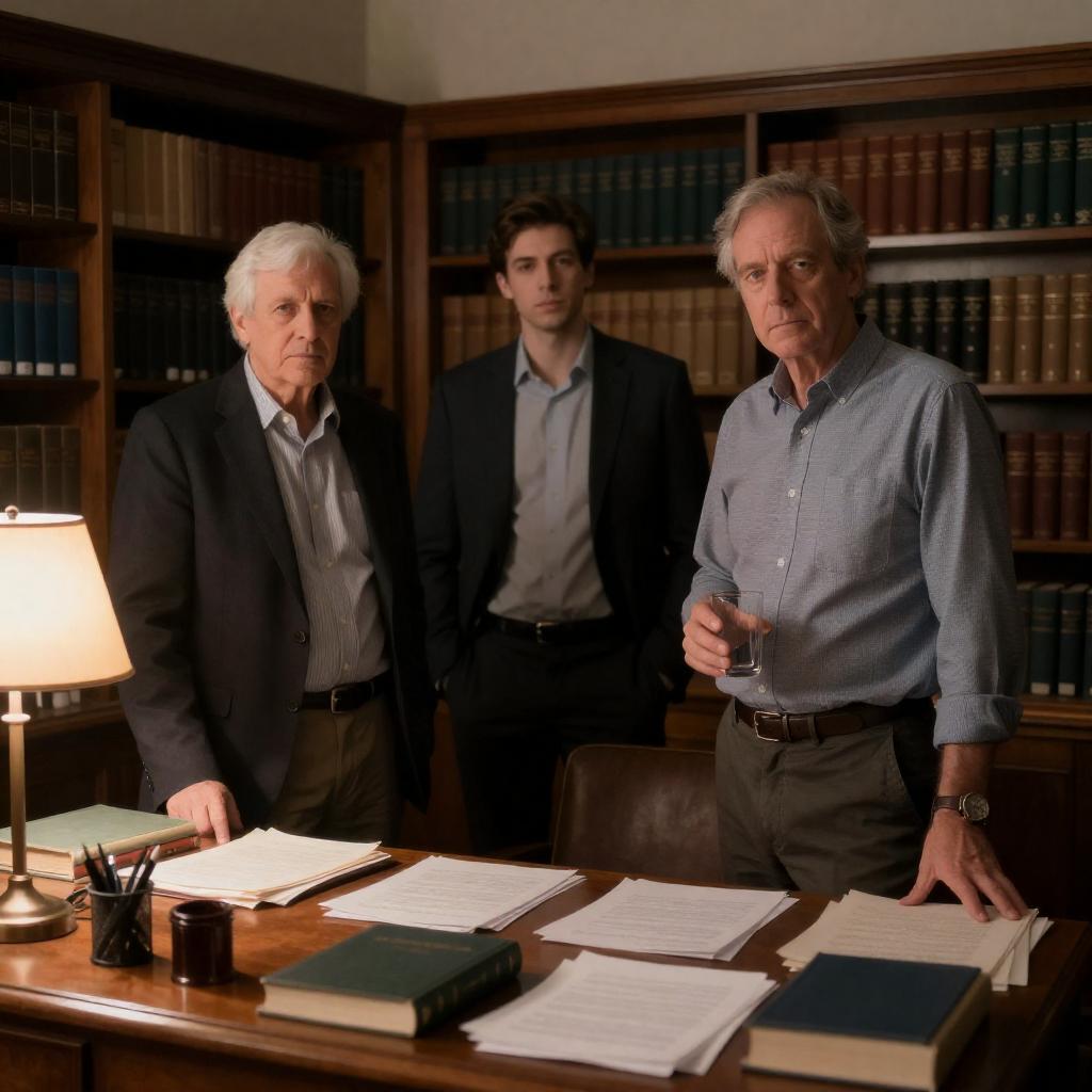 Two older men in formal black tuxedos, leaning over a desk, intense conversation. The man on the left has white hair, the man on the right has curly hair. Dimly lit office with wooden paneling, bookshelves, and a lamp.